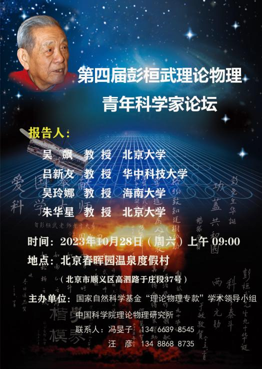 2023年10月28日(周六)上午9:00,由国家自然科学基金“理论物理专款”学术领导小组、中国科学院理论物理研究所主办的第四届“彭桓武理论物理青年科学家论坛”将在北京举行。