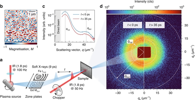 Abstract: X-ray scattering has been an indispensable tool in advancing our understanding of matter, from the first evidence of the crystal lattice to recent discoveries of nuclei’s fastest dynamics. In addition to the lattice, ultrafast resonant elastic scattering of soft X-rays provides a sensitive probe of charge, spin, and orbital order with unparalleled nanometre spatial and femto- to picosecond temporal resolution. However, the full potential of this technique remains largely unexploited due to its high demand on the X-ray source. Only a selected number of instruments at large-scale facilities can deliver the required short-pulsed and wavelength-tunable radiation, rendering laboratory-scale experiments elusive so far. Here, we demonstrate time-resolved X-ray scattering with spectroscopic contrast at a laboratory-based instrument using the soft-X-ray radiation emitted from a laser-driven plasma source. Specifically, we investigate the photo-induced response of magnetic domains emerging in a ferrimagnetic FeGd heterostructure with 9 ps temporal resolution. The achieved sensitivity allows for tracking the reorganisation of the domain network on pico- to nanosecond time scales in great detail. This instrumental development and experimental demonstration break new ground for studying material dynamics in a wide range of laterally ordered systems in a flexible laboratory environment.