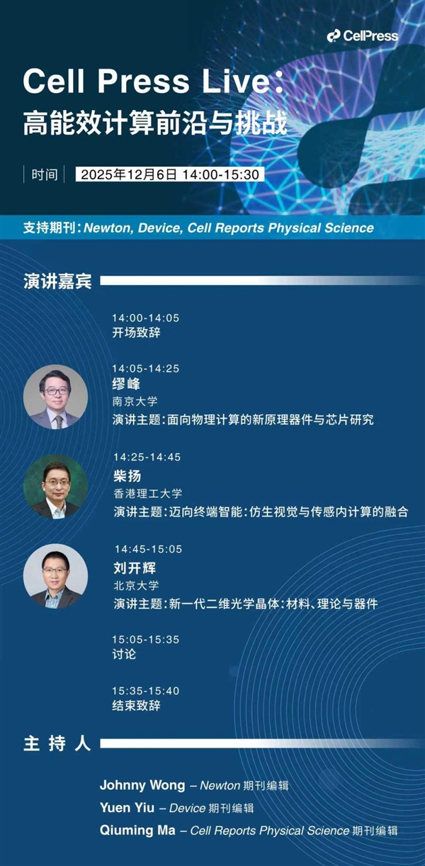 12月6日(周六)下午14:00-15:30,Cell Press细胞出版社旗下期刊Newton,Device和Cell Reports Physical Science将联合举办Cell Press Live线上讲座,主题为《高能效计算前沿与挑战》。这也是本年度最后一场Cell Press Live线上讲座。