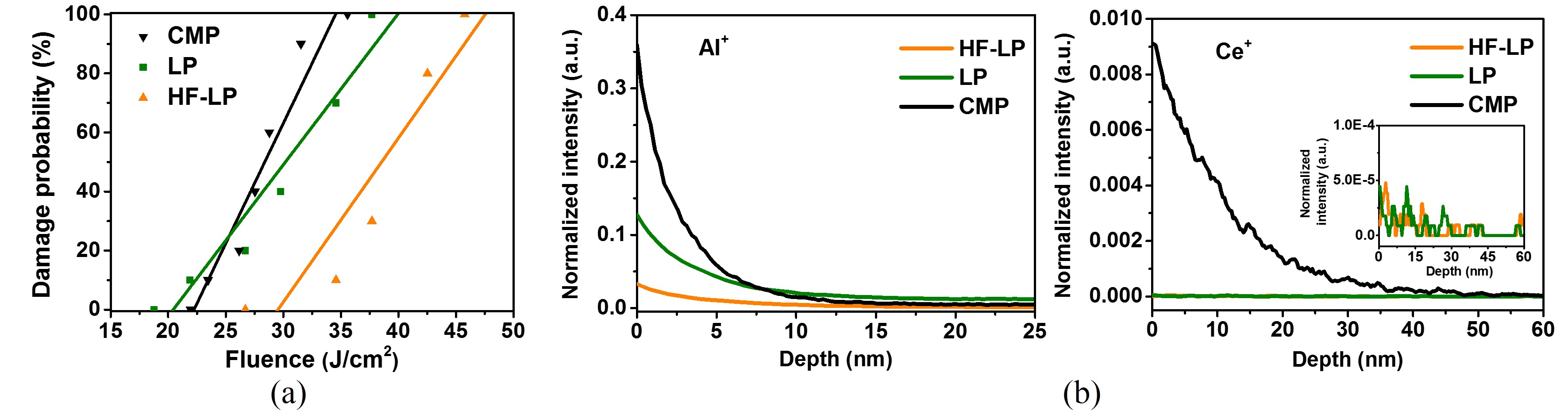 图2 不同工艺处理下的熔石英元件 (a)表面损伤概率 (b)污染元素深度分布