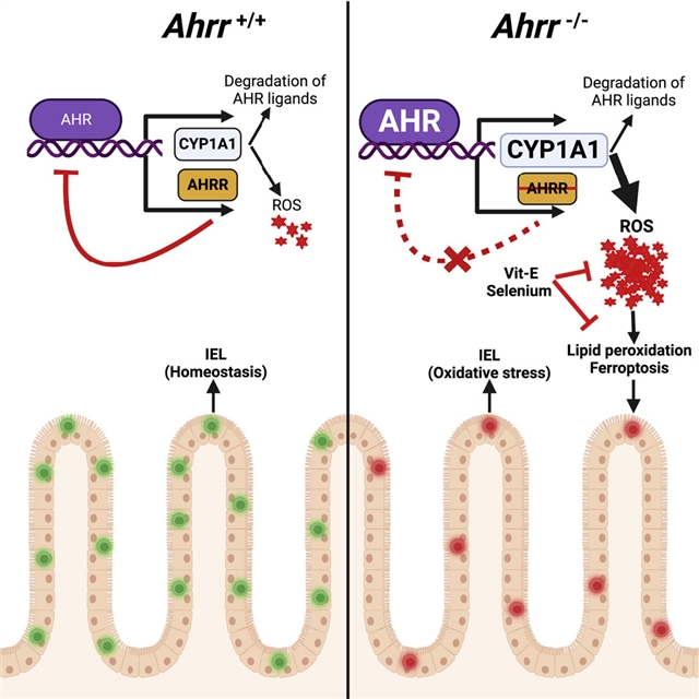 Abstract: The aryl-hydrocarbon receptor (AHR) is a ligand-activated transcription factor thatbuoys intestinal immune responses. AHR induces its own negative regulator, the AHRrepressor (AHRR). Here, we show that AHRR is vital to sustaining intestinal intraepitheliallymphocytes (IELs). AHRR deficiency reduced IEL representation in a cell-intrinsicfashion. Single-cell RNA sequencing revealed an oxidative stress profile in Ahrr/ IELs. AHRR deficiency unleashed AHR-induced expression of CYP1A1, a monooxygenasethat generates reactive oxygen species, increasing redox imbalance, lipid peroxidation,and ferroptosis in Ahrr/ IELs. Dietary supplementation with selenium or vitamin E to restore redox homeostasisrescued Ahrr/ IELs. Loss of IELs in Ahrr/ mice caused susceptibility to Clostridium difficile infection and dextran sodium-sulfate-induced colitis. Inflamed tissue of inflammatorybowel disease patients showed reduced Ahrr expression that may contribute to disease. We conclude that AHR signaling must betightly regulated to prevent oxidative stress and ferroptosis of IELs and to preserveintestinal immune responses.