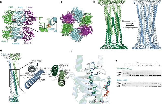 研究人员调查了只含有KaiBC的类球红细菌(Rhodobacter sphaeroides)的原始昼夜钟,以阐明其内部工作原理,尽管缺少KaiA。利用X射线晶体学和冷冻电镜的组合,研究人员发现了一个新的KaiC的十二边形折叠,其中两个六聚体被12个螺旋的盘绕束固定在一起。这种相互作用是由KaiC的羧基末端延伸形成的,并作为一个古老的调节分子,后来被KaiA所取代。日间和夜间构象之间的盘绕线圈注册转变通过一个跨度超过140埃的长程异构网络与磷酸化位点相连。这些动力学数据确定白天和夜间之间ATP-ADP比率的差异是驱动时钟的环境线索。它们还揭示了揭示自我维持振荡器演化的机制细节。