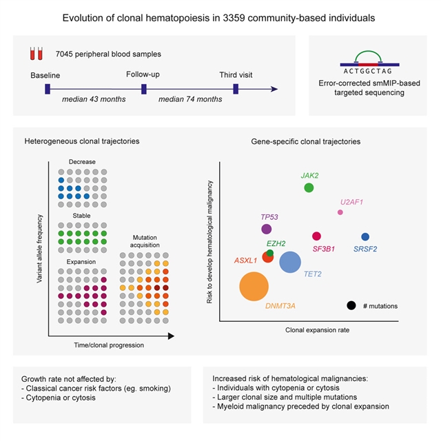 Abstract: Knowledge about evolution of clonal hematopoiesis, which may drive malignant progression,is crucial for clinical decision-making. We investigated the landscape of clonal evolutionby error-corrected sequencing on 7,045 sequential samples from 3,359 individuals inthe prospective population-based Lifelines cohort, with a special focus on cytosisand cytopenia. Spliceosome (SRSF2/U2AF1/SF3B1) and JAK2 mutated clones show highest growth rates over a median 3.6-year period, while clonesizes for DNMT3A and TP53 increase only marginally, independent of cytosis or cytopenia. Nevertheless, largedifferences are observed between individuals carrying the same mutation, indicativeof modulation by non-mutation-related factors. Clonal expansion is not dependent onclassical cancer risk factors (e.g., smoking). Risk for incident myeloid malignancydiagnosis is highest for JAK2, spliceosome, or TP53 mutations and absent for DNMT3A, and it is mostly preceded by cytosis or cytopenia. The results provide importantinsight into high-risk evolutionary patterns to guide monitoring of “CHIP” and “CCUS.”