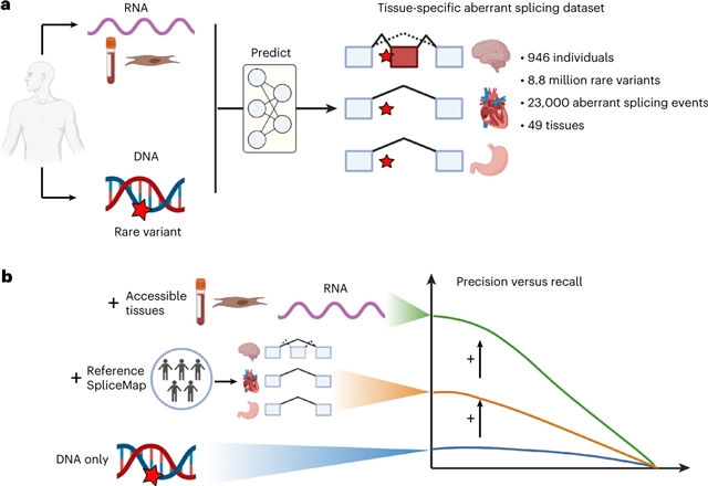 研究人员表示,异常剪接是遗传性疾病的主要原因之一,但仅能在临床可及组织的转录组中进行直接检测,如皮肤或体液。虽然基于DNA的机器学习模型可以优先考虑影响剪接的罕见变异,但其在预测组织特异性异常剪接中的效率仍未得到验证。