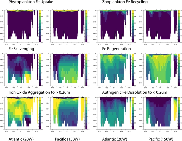 研究人员提出了一个新的溶解铁,配体和颗粒铁季节性数据集,来自百慕大大西洋时间序列研究(BATS)地区。研究发现,海洋上层溶解铁的动力学与配体,需要一个过程,通过这个过程,溶解铁脱离配体的稳定,生成一个沉淀到深处的自生铁颗粒库。当这个“胶体分流”机制在全球范围的生物地球化学模型中实施时,它再现了季节性铁循环动力学观察和以前模型失败时的独立全球数据集。
