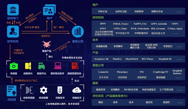 为解决这一问题,研究团队从作物表型产业需求出发,绘制了作物表型组大数据技术及装备产业图谱。该图谱涵盖了作物表型产业链的主要参与者,包括用户、研究机构、表型公司、政府部门和供应商等,并展示了各环节之间的信息和关系。通过对产业图谱的分析,研究团队发现了当前作物表型组大数据技术装备发展面临的诸多问题,如研发普适性差、重复研发现象严重、上下游集成工作量大、数据标准不一难以共享等。