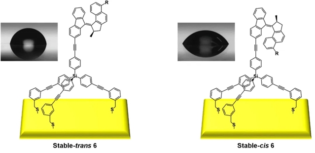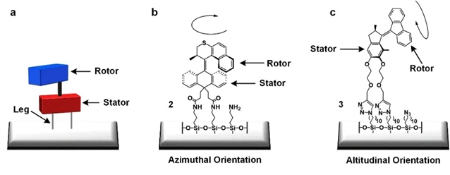 由于分子马达在溶液中不断的做布朗运动,因此很难协同分子马达的光响应旋转运动做有用功。通过对分子马达的定子部位进行修饰,引入各种“支腿”,把分子马达锚定在金或者石英等表面上,可以有效的组织和定向分子马达的排布,将转子相对于定子的旋转转化为相对于表面的绝对旋转,用于制备可逆可切换润湿性的智能表面。