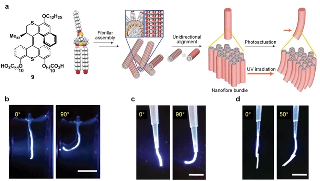 液晶聚合物网络结合了液晶的各向异性和聚合物网络的粘弹性,将分子马达交联到预定义取向的液晶聚合物网络中,分子马达的手性和光响应单向旋转运动可以在液晶基元协同效应的作用下进一步放大为材料的宏观运动,在软执行器领域具有广阔的应用前景。将外消旋分子马达交联入液晶聚合物网络中,可以实现材料的光响应弯曲、行走运动;手性分子马达在液晶聚合物网络中具有双重功能,既可以作为手性掺杂剂诱导液晶分子形成对应手性的胆甾相螺旋结构,也可以作为单向旋转分子,将分子运动放大成可逆的左旋或右旋宏观螺旋运动。进一步利用光控取向技术,对液晶聚合物网络中液晶基元以及分子马达的取向进行编程,可以实现更复杂的形状变化和运动,如波浪、复杂的螺旋运动等。