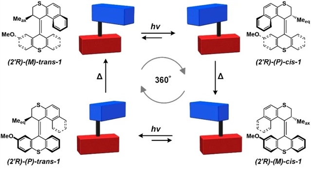 光驱动分子马达通常由上半部分转子和下半部分定子组成,中间由C=C双键连接。在紫外光和热的交替刺激下,转子可以围绕中心C=C双键发生360°定向旋转。