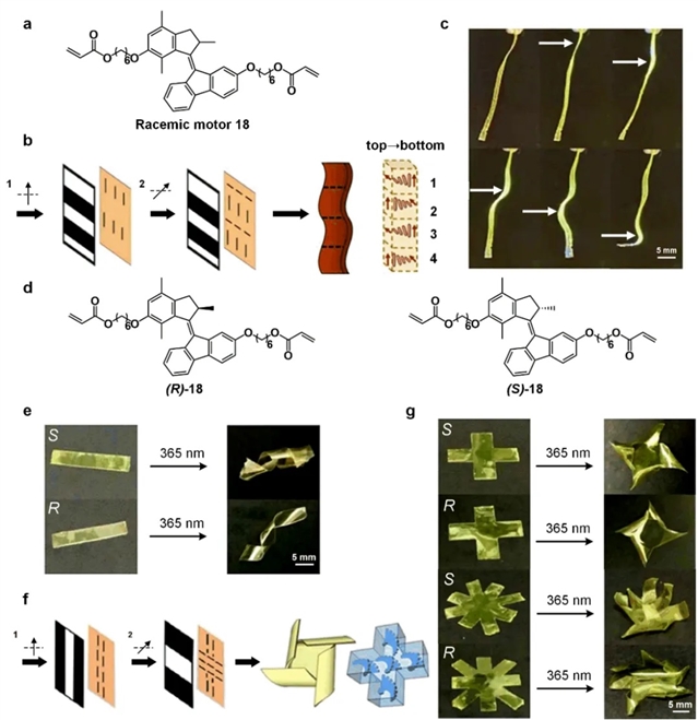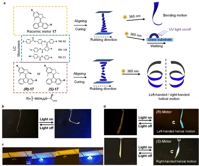 图6 基于可交联分子马达制备的液晶高分子材料的光响应弯曲、行走和宏观螺旋运动