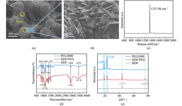 本研究以铜泡沫(CF)为模板,通过微波等离子体化学气相沉积(MPCVD)在其表面生长金刚石薄膜。为消除铜与金刚石的晶格失配,预先采用射频磁控溅射沉积钛(Ti)中间层,随后通过激光穿孔与酸浸蚀去除CF模板,最终获得了轻质、高孔隙率的HDF骨架(图1)。扫描电镜(SEM)显示,HDF呈现均匀连续的微米级孔洞结构,金刚石晶粒尺寸为3–5 μm,形成金字塔形微晶表面。拉曼光谱进一步证实金刚石薄膜的高结晶质量(特征峰位于1331.98 cm-1),而X射线衍射(XRD)与傅里叶变换红外光谱(FTIR)表明,HDF与PEG2000仅通过物理结合,未发生化学反应(图2)。
