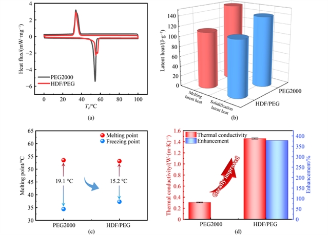 通过熔融渗透法将PEG2000封装于HDF骨架中,结果表明,制备的HDF/PEG复合材料展现出显著优化的热性能。差示扫描量热(DSC)测试显示,其潜热为111.48 J/g,虽因HDF占位较纯PEG(152.06 J/g)有所降低,但过冷度从19.1 ℃降至15.2 ℃,潜热差异从12.61 J/g缩小至0.17 J/g。激光闪射法(LFA)测得复合材料的室温热导率达1.458 W/(m·K),较纯PEG提升了378%(图3),归因于HDF内部连续的高导热网络。热重分析(TGA)显示,HDF/PEG在320 ℃以下具备优异的稳定性,且循环100次后性能衰减小于10%。