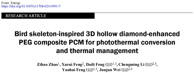 Zihao Zhao, Xurui Feng, Daili Feng, Chengming Li, Yanhui Feng, Junjun Wei. Bird skeleton-inspired 3D hollow diamond-enhanced PEG composite PCM for photothermal conversion and thermal management. Front. Energy, https://doi.org/10.1007/s11708-025-0991-7