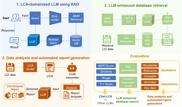 Chat-LCA系统实现了LLM在“知识获取—数据检索—报告生成”全链条的深度融合,显著提升了碳核算的智能化水平。该研究的原创性体现在首次将检索增强生成(RAG)、Text2SQL、思维链(CoT)与代码链(CoC)等前沿AI技术系统整合于LCA全流程,构建了支持自然语言交互的一体化碳核算智能系统。Chat-LCA有效打通了知识壁垒与数据孤岛,实现了从专业问答到报告生成的全流程自动化,突破了现有研究中技术覆盖片面、环节割裂的局限。