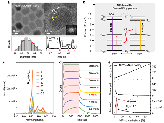 为解决该问题,研究者采用吸收800 nm红外光的钕(Nd3+)离子作为替代敏化剂,有效抑制了热效应,但Nd3+敏化上转换仍存在量子产率低的缺陷(Q.Y. <1%),迫使系统依赖高功率密度激发。这不仅增加细胞及目标分析物的光损伤风险,还对激光器稳定性造成压力,阻碍了其商业化应用。