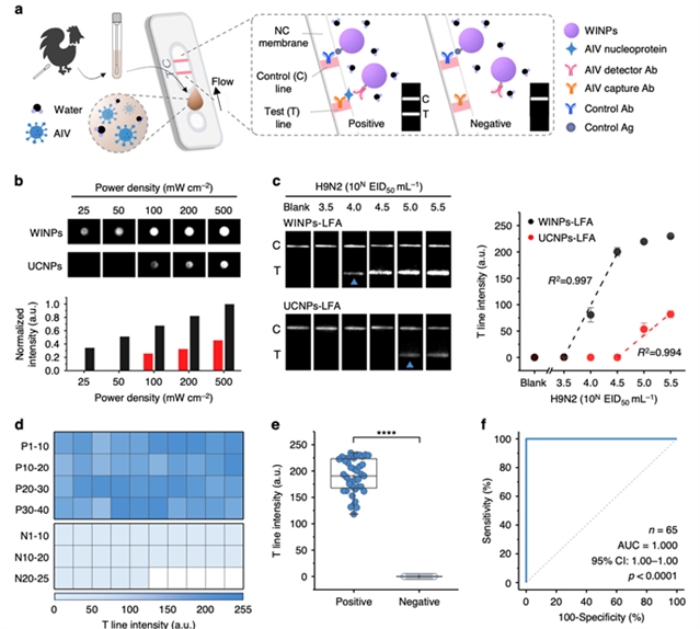 团队通过单粒子水平光谱表征,证实了其在干燥和水环境中,功率密度阈值和荧光寿命谱均保持一致。并且,WINPs实现了高达22.1 ± 0.9%的量子产率,其检测阈值功率比上转换荧光纳米粒子(UCNPs)低15倍,有效消除了背景噪声,提升了整体性能。在基于WINPs的禽流感病毒(AIVs)样本检测中,在仅100 mW cm−2的激发功率下,实现了100%的灵敏度,且曲线下面积(AUC)达到1.000。