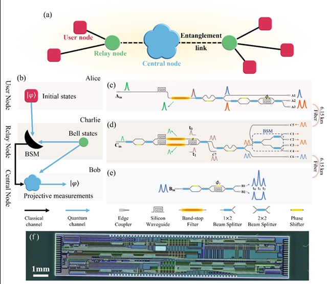 图1:(a) 星形拓扑量子网络中量子隐形传态应用场景。 (b) 用户节点、中继节点和中心节点间的光子量子隐形传态功能。 (c)-(e) 用户、中继和中心节点的硅光量子芯片片上光路设计。 (f) 制备出的硅光子芯片的照片,集成了三个节点的片上光路