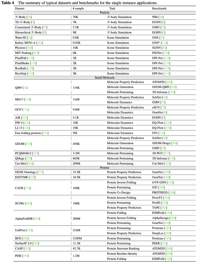在科学应用方面,该综述涵盖了物理(粒子)、生物化学(小分子、蛋白质)和晶体等其他应用等多个应用场景。文章总结了针对不同任务的各种几何图神经网络,并介绍了每个任务中常用的数据集。
