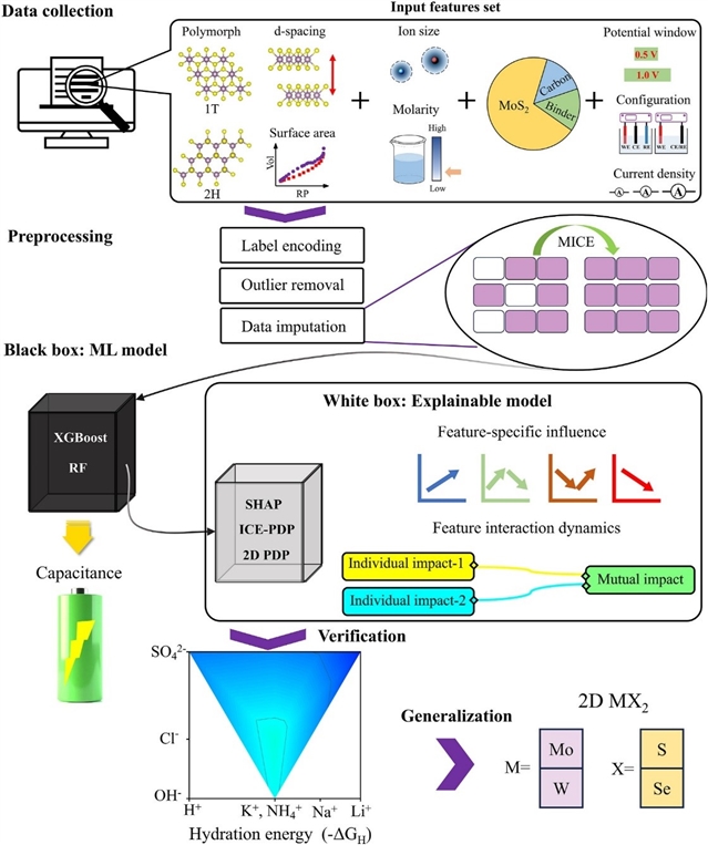 本研究确立了电解液水合能作为调控二维电极材料中离子特异性电容的通用描述符。通过采用SHAP、PDP和ICE等先进可解释机器学习方法,揭示了水合壳稳定性与离子-电极相互作用是决定二维MoS2电荷存储行为的关键因素。这些发现通过对原始实验数据的无模型分析得到验证,表明较低水合能的离子能产生更高电容。进一步在WS2、MoSe2和WSe2等其他二维材料中验证了这一规律,从而强化了水合能作为普适性性能预测指标的可靠性。本研究突破传统聚焦离子尺寸的局限,将水合能确立为更可靠的电解液筛选标准。通过将分子层面机理与可解释人工智能相融合,该研究为超级电容器及相关离子基技术(电池、电催化与能量转换系统)的理性电解液设计提供了统一框架。