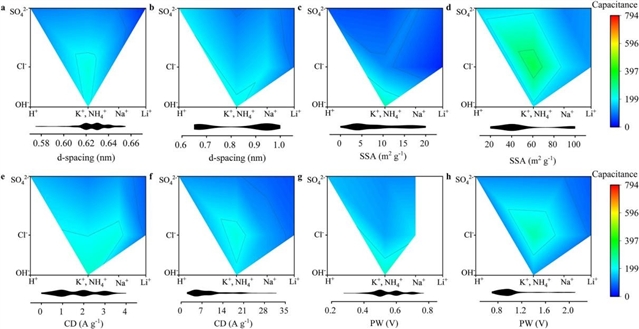 图5. 关键电极参数和操作参数固定条件下,电容与离子类型关系的等高线图。不同固定特征的数值范围:(a,b)层间距,(c,d)比表面积,(e,f)电流密度,(g,h)电位窗口