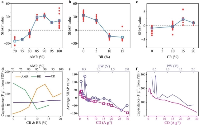 图6. 制备参数与操作参数对电容的影响分析及特征重要性评估。(a-c)活性材料比例、粘结剂比例和碳材料比例的SHAP散点图,(d)活性材料比例、粘结剂比例和碳材料比例对电容的独立影响,(e)平均SHAP值,(f)PDP点