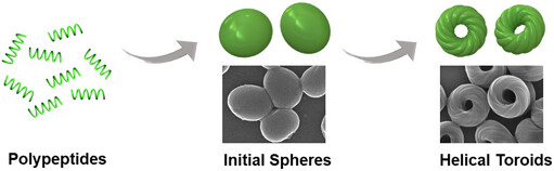Abstract: Self-assembly has proven to be a robust strategy for constructing intricate hierarchical structures. The construction of chiral or toroidal nanostructures has attracted considerable attention. However, hierarchical nanostructures involving both chiral and toroidal features are rarely reported and related mechanism is less understood. Herein, we report a discovery of toroids with controllable helical senses from the one-pot self-assembly of polypeptides. Through the addition of selective solvent to polypeptide solution and the followed dialysis, uniform toroids with left-handed helical structures are formed. Mechanism analysis revealed that the polypeptides are initially assembled into spherical aggregates, then the spheres perforated into toroids during the dialysis process. Simultaneously, chain rearrangement occurs, resulting in an ordered packing of polypeptides within the toroids and the formation of helical structures. The formation of helical toroids can be well controlled by the assembly conditions, and its chirality was found to be dependent on the polypeptide backbone chirality. This is a pioneering example of one-pot self-assembly of hierarchical structures containing multiple topological features, providing a straightforward efficient strategy for constructing complicated nanostructures with chiral and toroidal features.
