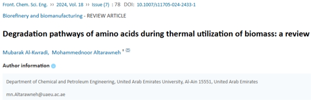 阿联酋大学化学与石油工程系Mohammednoor Altarawneh教授等在《Frontiers of Chemical Science and Engineering》发表了题为“Degradation pathways of amino acids during thermal utilization of biomass: a review”(生物质热利用过程中氨基酸的降解路径研究进展)的综述论文。文章系统梳理了氨基酸的结构特性、生物质中的生成产率,以及在高温和水介质中的降解机制,重点探讨了脱氨基和脱羧基两种主要反应路径,并分析了侧链基团对降解产物的影响。