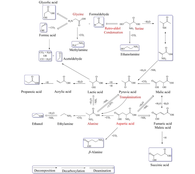 氨基酸的降解主要通过脱氨基(释放氨气)和脱羧基(释放二氧化碳)反应进行,两者的竞争机制受分子结构调控。例如,丙氨酸在水热条件下通过脱氨基生成乳酸,进一步脱水形成丙烯酸;天冬氨酸则优先发生脱氨基反应,生成马来酸和富马酸。侧链基团的差异显著地影响反应路径:含硫氨基酸(如半胱氨酸)因巯基的高反应活性,更易通过脱巯基引发降解;芳香族氨基酸(如苯丙氨酸)则通过侧链双键扩展生成苯乙烯等稳定产物。