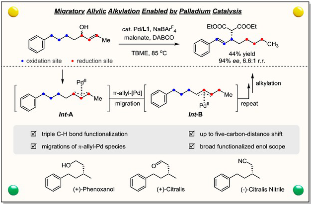 研究组开发了一种通过钯催化实现1,2-烯醇不对称迁移烯丙基取代的三重C–H键对映选择性官能化方法。该迁移烯丙基取代策略具有优异的普适性,能在精确调控化学、区域和对映选择性的条件下,兼容多种亲电试剂和亲核试剂。此迁移烷基化反应为氧化还原中性过程:三个C(sp3)–H键被氧化以实现烷基化官能化,而原始烯醇单元则同时被还原。机理研究表明,每次一碳迁移均包含连续的β-H消除与迁移插入步骤,通过二烯-钯络合物中间体形成新的π-烯丙基钯物种。该方法已成功应用于生物活性物质(+)-Phenoxanol、(+)-Citralis及(−)-Citralis Nitrile的合成。