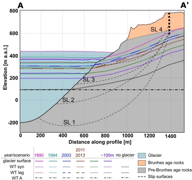 模拟结果表明,冰川卸载确实对边坡稳定性产生显著的失稳效应。随着冰川变薄,所有预设滑移面的安全系数均呈现下降趋势。这种失稳效应的程度主要取决于潜在滑移面的几何形态和深度:滑移面越深,延伸到冰川下方的部分越多,冰川卸载导致的相对安全系数损失就越大(例如,最深的SL1滑移面从1890年至完全消融,安全系数下降了约35.6%);而较浅的滑移面在冰川消退到其下方后,失稳效应则趋于稳定。研究还特别指出,2013年发生的碎屑崩积物覆盖在冰川表面,其附加荷载使边坡安全系数有小幅回升(约0.3-0.8%),这解释了为何边坡变形在近年趋于停滞。此外,研究探讨了水文条件的关键作用。当考虑冰川减薄会同步降低其下承压水压,从而导致边坡内地下水位下降时,这种水文效应会起到稳定作用。对于深部滑移面,冰川卸载的失稳效应占主导,安全系数总体仍下降;而对于浅部滑移面,地下水位的降低带来的稳定效应可能超过冰川卸载的失稳效应,导致安全系数在冰川消退后反而升高。模拟还揭示,在冰川快速减薄期间,如果边坡内地下水位调整滞后于冰川下伏水压的下降,会形成一个暂时的“水力梯度窗口期”,在此期间边坡稳定性会额外降低,这可能解释了2000年代初期边坡变形活跃的现象。外部触发因素如地震(模拟显示,相当于0.1g地面加速度的地震可使安全系数降低约15-19%)或强降雨,在冰川持续减薄的背景下,更容易引发失稳。