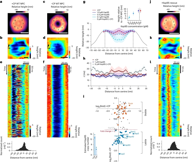 Abstract: Nuclear pore complexes (NPCs) mediate selective exchange of macromolecules between the nucleus and cytoplasm, but the organization of their transport barrier has been a matter of debate. Here we used high-speed atomic force microscopy, complemented with orthogonal in vitro and in vivo approaches, to probe the dynamic behaviour of the NPC central channel at millisecond resolution. We found that nuclear transport factors dynamically remodel intrinsically disordered phenylalanine-glycine (FG) domains tethered within the NPC channel, partitioning the barrier into two zones: a rapidly fluctuating annular region and a highly mobile central plug. Increased FG-repeat density in mutant NPCs dampened barrier dynamics and impaired transport. Notably, NPC-like behaviour was recapitulated in DNA origami nanopores bearing transport factors and correctly tethered FG domains but not in in vitro FG hydrogels. Thus, the rotationally symmetric architecture of NPCs supports a nanoscopic barrier organization that contrasts with many of the bulk properties of in vitro FG-domain assemblies.