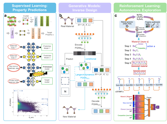 图2. 核心算法和范例。(a)使用CGCNN的迁移学习解决了材料属性预测监督学习中的数据稀缺问题;(b)生成模型加速了新型二维材料的逆向设计和发现;(c)深度强化学习用于逆向无机材料设计