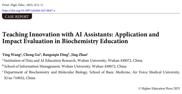 武汉大学王郢教授团队在Frontiers of Digital Education(《数字教育前沿(英文)》)期刊上发表了一篇题为Teaching Innovation with AI Assistants: Application and Impact Evaluation in Biochemistry Education的文章,将名为Blueink的AI教学助手引入大学生物化学课程,通过培训前后的对比调研,评估参与者在知识、AI使用及批判性思维技能等方面的变化。