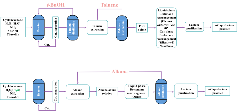 图2:以H2O2为氧化剂,在t-BuOH溶剂(上)或水溶剂(下)中环己酮氨肟化生产己内酰胺的工艺对比。