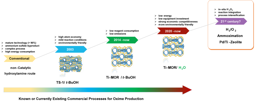 作为己内酰胺合成的重要中间体,环己酮肟的工业化生产经历了一系列技术迭代(图1)。传统工艺以环己酮和羟胺衍生物(如强酸性的硫酸羟胺、磷酸羟胺)为原料,通过非催化肟化反应制备。该工艺存在过程复杂、反应体系强腐蚀性以及副产大量低附加值铵盐等问题。采用钛硅分子筛催化环己酮、氨与H2O2一步酮氨肟化制备环己酮肟有效克服了传统工艺的诸多不足,被公认为一种可持续、环境友好的环己酮肟合成路线。该一锅法工艺无需使用酸、卤素或氮氧化物等有害试剂,并显著降低副产物生成。通过将TS-1/H2O2/NH3氨肟化工艺与Silicalite-1催化的气相贝克曼重排相结合,日本住友化学公司于2003年成功实现己内酰胺工业化生产,年产能达6万吨,该工艺被誉为绿色化学的典范。随后,该TS-1催化氨肟化技术在中国石化以及其他多家石化与精细化工企业中得到推广。在此基础上,华东师范大学吴鹏教授团队进一步开发出12元环大孔钛硅分子筛Ti-MOR,其氨肟化性能显著优于TS-1。2016年,Ti-MOR/H2O2氨肟化工艺首次在中国三宁化工实现年产10万吨环己酮肟的工业化生产,并推广至多家己内酰胺及丁酮肟生产企业。Ti-MOR的优势主要源于其更大的孔道结构,有利于反应物与产物的扩散传质,从而显著提升催化活性和稳定性。