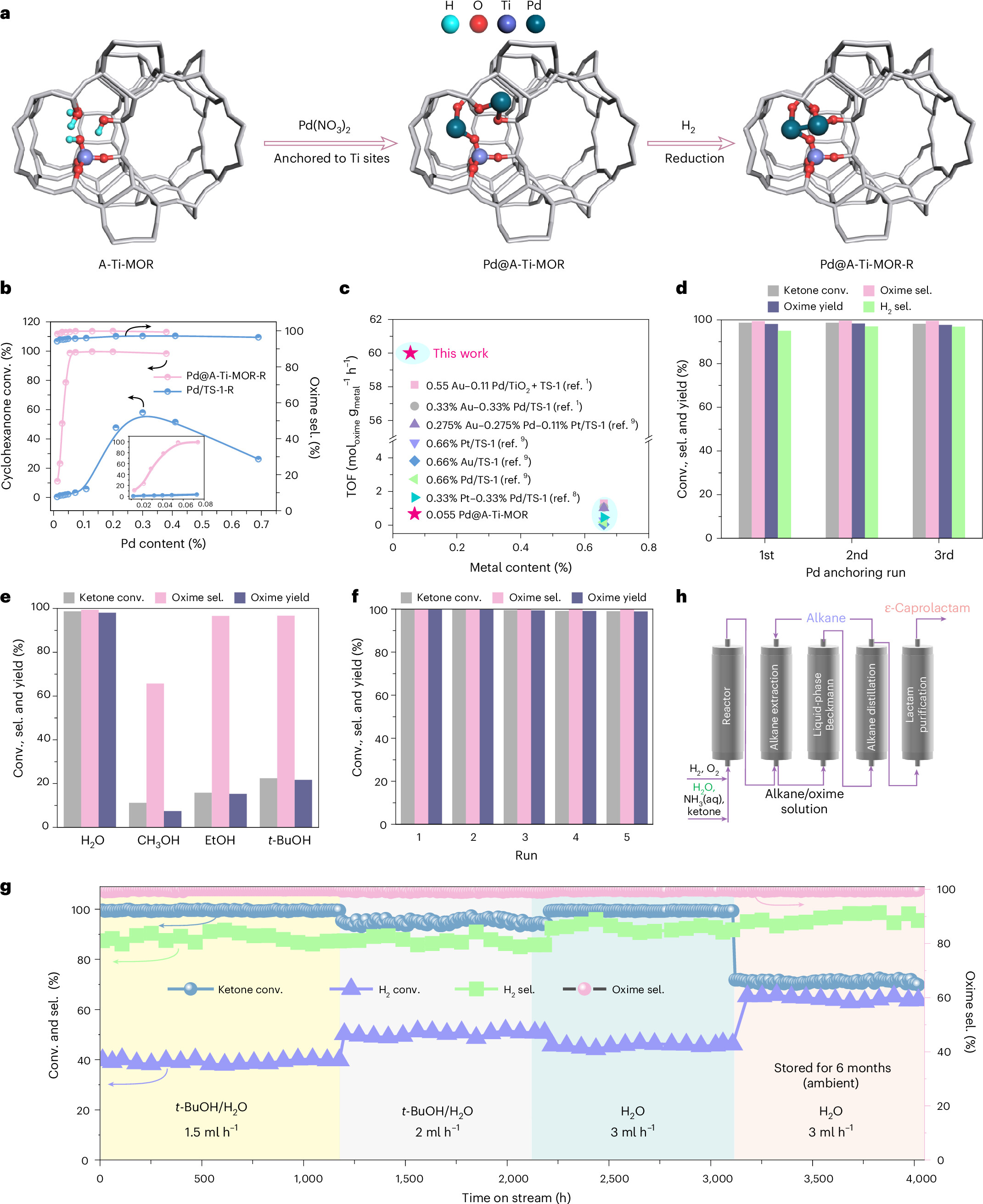 采用之前报道的具有丰富的缺陷钛位点的A-Ti-MOR作为载体来锚定Pd物种,并进一步H2还原制备了Pd@A-Ti-MOR-R催化剂,用于以H2/O2为原料的环己酮氨肟化反应。首先考察了Pd负载量对性能的影响,发现即使Pd载量低至0.055 wt.%,环己酮转化率和肟选择性都接近99%;而在相同Pd载量下,工业用TS-1表现出非常低的环己酮转化率(低于5%)。Pd@A-Ti-MOR-R催化剂表现出超高的环己酮肟收率(60 moloxime gmetal−1 h−1)。进一步,考察了催化剂制备过程含Pd滤液的可重复使用性,发现未被钛硅载体锚定的Pd物种可重复用于下一轮催化剂制备。溶剂效应考察结果显示H2O是Pd@A-Ti-MOR-R催化H2/O2环己酮氨肟化最佳溶剂。间歇釜式反应证实Pd@A-Ti-MOR-R催化剂可重复使用。在固定床连续反应,Pd@A-Ti-MOR-R无论是在t-BuOH/H2O混合溶剂还是在纯水溶剂中,环己酮肟选择性都接近99%,氢气选择性稳定在(86-98%),稳定运行时间超4000 h。基于Pd@A-Ti-MOR-R超高的催化活性和稳定性,研究组创新地提出从H2/O2出发水相无有机溶剂环己酮氨肟化耦合烷肟贝克曼重排制备己内酰胺新技术;不依赖有机溶剂t-BuOH和商用H2/O2,有望以更加可持续和环境友好的方式实现己内酰胺的生产,同时显著降低后续产物分离与纯化过程中的成本。