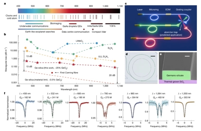 研究组提出了一种基于锗硅酸盐(构成光纤卓越性能的材料)的超低损耗PIC平台,但该平台是通过完全兼容CMOS代工厂的工艺实现的。这些PICs在从紫光到电信波长范围内实现了超过1.8亿的谐振器Q因子。在电信波段,它们无需热处理即可获得高出10分贝的品质因子,从而扩大了与有源组件异构集成的机会。该平台的其他特性包括易于设计的波导色散、声模限制以及大模面积诱导的热稳定性——分别通过孤子微梳生成、受激布里渊激光发射和低频噪声自注入锁定来证明。