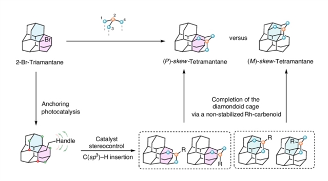 金刚石的基本手性组分——斜四金刚烷——具有极高的刚性、稳定性和精确定义的几何结构,是σ-螺烯母体结构的缩影。虽然斜四金刚烷在化石燃料中天然存在,但其微量含量极低,几十年来人们对其选择性合成的努力仍未取得成果。