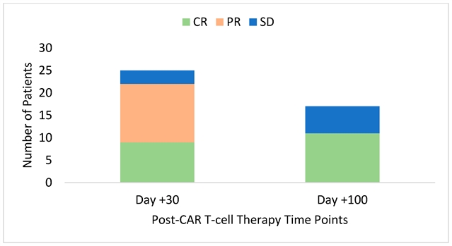 CAR T治疗后第+30天和第+100天患者PET评估缓解情况堆叠柱状图;完全缓解(CR)、部分缓解(PR)及疾病稳定(SD))