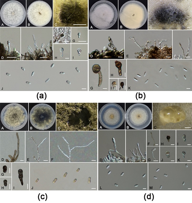 图3 炭疽菌4个新物种(C. aquilariae、C. crataegi、C. dongguanense和C. flavosporum)的形态图
