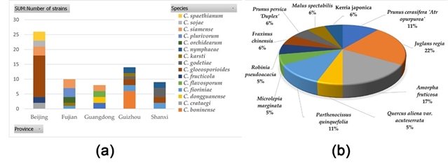 地理分布差异显著:北京物种多样性最高(共6种,包括1个新物种),广东是新物种热点,推测地理隔离促进了新物种形成;C. gloeosporioides分离率最高,广泛分布于北京、陕西和贵州,显示其强适应性(图4)。