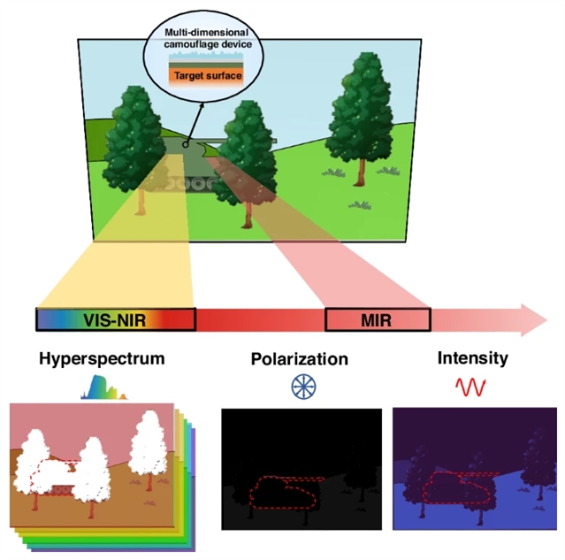 伪装在现代安全和军事行动中至关重要,它在规避探测和提高装备生存能力方面发挥着关键作用。然而,大多数现有的伪装装置仅在单一维度上运作,无法应对新兴的多维探测技术,包括可见光至近红外(VIS-NIR)高光谱成像和中红外(MIR)偏振成像。