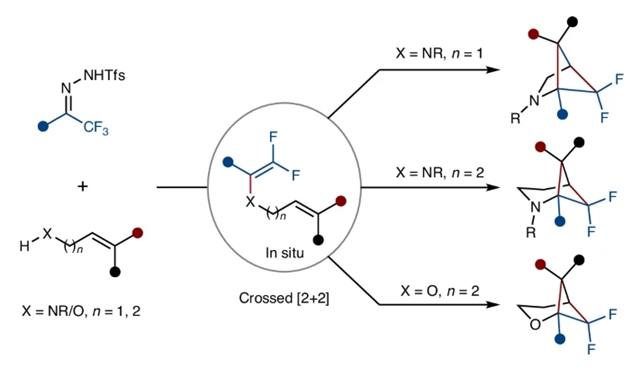 研究组报道了一种分步进行的自由基分子内热力学交叉[2 + 2]环加成反应,该反应利用原位生成的N-(丙)烯基1,1-双氟烯胺和同丙烯基1,1-双氟乙烯基醚的氟效应实现。银催化下的N-(丙)烯胺和同丙烯醇分别与三氟甲基三氟甲磺酰肼进行1,1-双氟烯基化反应后,原位生成的1,1-双氟烯烃发生分子内交叉[2 + 2]环加成反应,能够高效合成多种具有医学价值的1,1-双氟杂二环[n.1.1]烷烃,包括氮杂双环[2.1.1]己烷、氮杂双环[3.1.1]庚烷和氧杂双环[3.1.1]庚烷等结构。