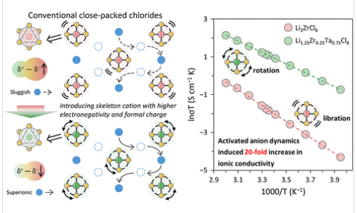 Abstract: Chloride-based solid electrolytes are promising for all-solid-state batteries owing to their favorable oxidative stability and mechanical deformability. However, most chlorides exhibit only moderate ionic conductivity, primarily due to the restricted ion transport imposed by their close-packed anion frameworks. In this work, we address this limitation by enhancing anion framework flexibility through lowering the negative charge on chloride anions, achieved by incorporating high-valent, highly electronegative cations, accompanied by a reduction in the lithium content. Computations reveal that this strategy substantially decreases the energy barriers for anion reorientation, leading to a more flexible anion framework characterized by intensified libration and even activated rotation. These anion dynamics transiently widen Li+-ion transport bottlenecks and distort local coordination environments, thereby flattening the energy landscape and enabling fast ion diffusion. The effectiveness of this strategy was experimentally validated, with the tailored chloride electrolytes achieving ionic conductivities as high as 10.3 mS cm–1 at room temperature. Solid-state batteries utilizing Li1.25Zr0.25Ta0.75Cl6 as the catholyte deliver outstanding rate capacity and cycling performance, retaining 82.5% capacity after 20,000 cycles at 4C. These findings offer new insights into the ion transport mechanism in close-packed chlorides and provide guidelines for designing superionic conductors.