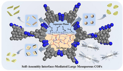研究组构建了稳定且形貌可调的反应性界面,通过Schiff碱反应衍生的两亲性基团自组装实现,无需表面活性剂即可稳定界面,且其形态可由脂肪胺的疏水链长(C4–C12)灵活调控。界面限制作用降低了成核势垒,局域单体富集加速反应进程,从而可在温和条件下可控合成具有多类介观架构(球形/带状/片状)的共价有机框架(COFs)。进一步在界面上引入二氧化硅纳米球可共组装形成稳定纳米级Pickering乳液(需注释:皮克林乳液),从而突破本征孔径限制合成出具有可调大介孔(17-40 nm)的分级多孔COFs。