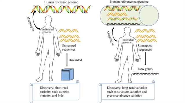 图1 传统人类基因组研究与人类泛基因组研究的差异示意图