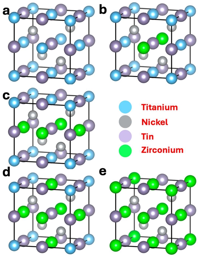 对于第一性原理计算,作者均使用 VASP 代码中的投影缀加波 (PAW) 方法。为了优化晶胞和原子位置,使用了 Perdew–Burke–Ernzerhof (PBE) 泛函。此外,将平面波展开的能量截断值设置为 520 eV。使用 Monkhorst–Pack 方法,以 0.01 eV 的展宽创建布里渊区积分的 K 点网格,目标精度为 0.02。两个自洽循环之间的电子收敛标准设置为 10-8 eV,离子收敛标准设置为 10-6 eV/Å,以获得用于声子计算的无残余力的结构。使用Phonopy 代码基于冻结声子模型创建位移,以计算热力学性质。TiNiSn 半赫斯勒合金使用包含 12 个原子的晶胞,并在 Ti 位点用 Zr 原子以 25%、50% 和 75% 的比例引入无序。使用 sqsgen 代码生成 TixZr1-xNiSn 半赫斯勒合金的无序晶胞。使用 VESTA 程序可视化所有合金的晶胞,如图 1 所示。