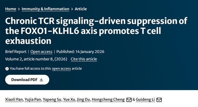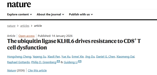 2026年1月14日,中国医学科学院系统医学研究院/苏州系统医学研究所(以下简称“系统所”)李贵登团队与Fred Hutchinson癌症研究中心的Philip D. Greenberg团队合作,在Nature和Immunity & Inflammation上同步发表题为“The Ubiquitin Ligase KLHL6 Drives Resistance to CD8+ T Cell Dysfunction”和“Chronic TCR Signaling-Driven Suppression of the FOXO1-KLHL6 Axis Promotes T Cell Exhaustion”的两篇研究论文。这两项研究揭示了持续TCR刺激通过抑制FOXO1的转录活性,导致E3泛素连接酶KLHL6的持续下调,这一分子事件正是驱动T细胞走向耗竭的关键开关。KLHL6的降低抑制了耗竭核心调控因子TOX以及线粒体稳态因子PGAM5的降解,从而启动耗竭程序并破坏线粒体功能,最终推动T细胞向终末耗竭状态分化并失去抗肿瘤能力。这一发现从根本上回答了“持续TCR信号如何驱动T细胞耗竭”这一关键科学问题,并从蛋白信号转导和蛋白稳态调控这一崭新维度为解析T细胞耗竭分化的分子机制提供了重要理论依据。
