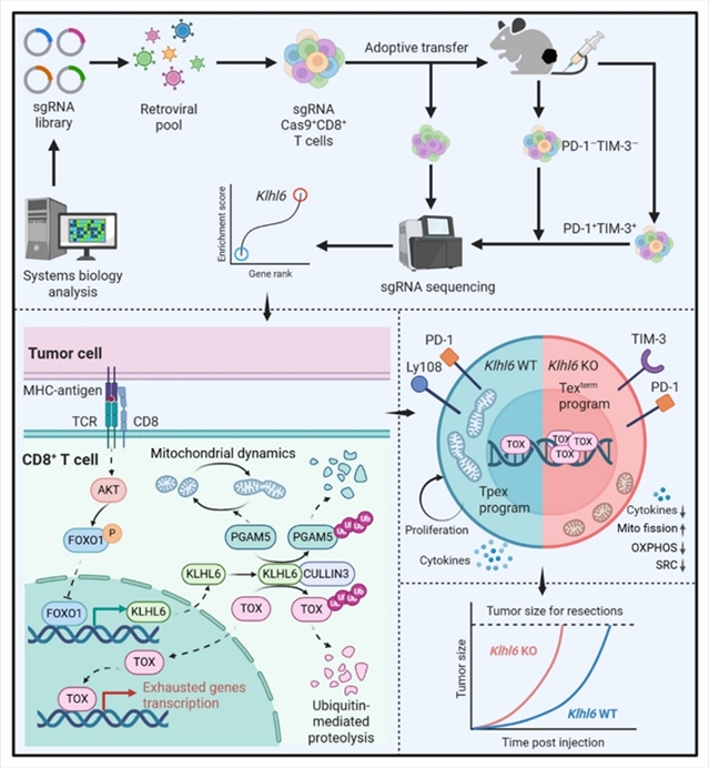 为解决这一科学问题,研究团队首先整合分析了来自病毒感染和肿瘤模型的CD8+ T细胞基因表达数据,利用计算生物学分析的方法,发现蛋白质降解系统相关通路在耗竭和线粒体功能紊乱的T细胞中差异富集,提示该途径与T细胞功能紊乱密切相关。基于此,研究团队设计了一种基于计算分析指导的“双重”CRISPR筛选策略,鉴定出泛素化酶KLHL6是同时调控T细胞耗竭程序与细胞内能量代谢的关键因子。进一步研究发现,KLHL6的表达受到TCR信号的精密调控。短暂性TCR信号刺激会通过AKT-FOXO1通路暂时抑制KLHL6表达,但随后其表达会恢复正常。然而,在持续性TCR信号刺激下,KLHL6的表达被长期抑制并持续处于低水平,最终触发耗竭程序。