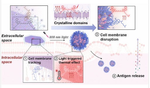 Abstract: Achieving precise spatiotemporal modulation of immunostimulatory effects remains a fundamental barrier in tumor immunotherapy, particularly in the context of limited tumor antigen exposure and an immunosuppressive microenvironment. Herein, we present a light-responsive “dynamic nanopatch” platform that addresses these challenges through morphology-directed and interface-programmed immunoactivation. Constructed from crystalline poly(ε-caprolactone) and integrated with photothermal conversion elements, the nanopatch undergoes a near-infrared (NIR)-triggered morphology-dynamic transition from a two-dimensional planar structure to a zero-dimensional spherical counterpart. This dynamic structural transformation enables programmable interactions with the cellular membrane, establishing a versatile nanointerface capable of the in situ regulation of cancer cell membrane integrity. Upon NIR irradiation, the nanopatch stably adheres to the tumor cell surface and initiates a cascade of adhesion, deformation, and internalization events. This process promotes localized mechanical stress and membrane perturbation, enhancing the release of tumor-associated antigens and damage-associated molecular patterns, which collectively initiate potent immunogenic cell death. Subsequent activation of antigen-presenting cells leads to robust adaptive immune engagement and amplified immune cell infiltration within the tumor microenvironment. This morphodynamic nanopatch offers a highly controllable strategy for cancer immunotherapy and a new paradigm for interface-programmed functionalities with broad implications for precision medicine, immunotherapy, and biomaterial engineering.